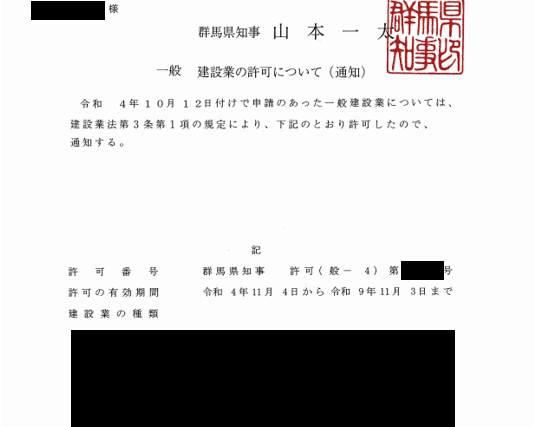 新規の建設業許可の取得に成功しました。 500万円以上の工事を請け負うためには、許可必須です。